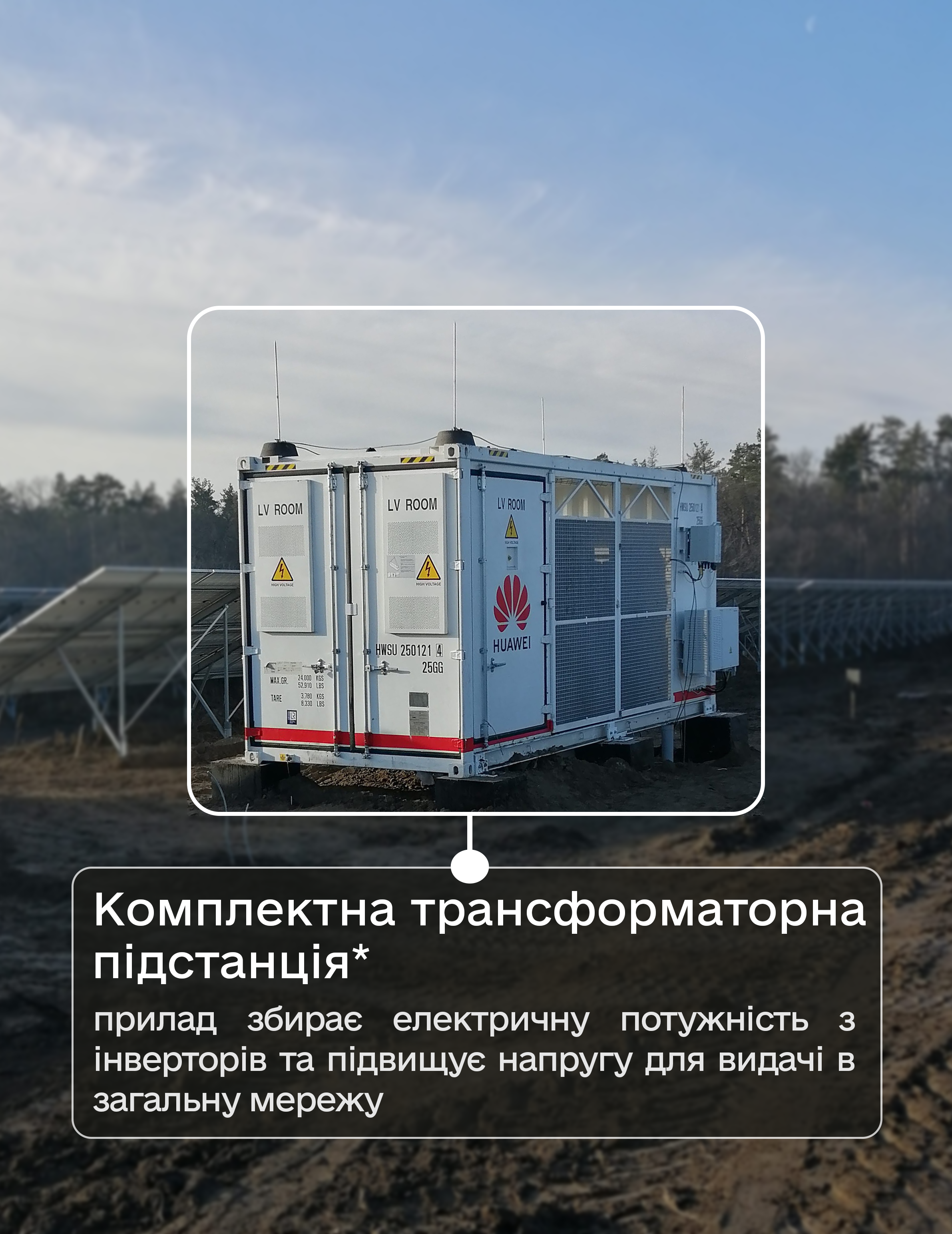 Ми вже згадували комплектну трансформаторну підстанцію (КТП) в минулих дописах. Її роль полягає в зборі виробленої інверторами електроенергії, підвищення напруги та видачі її до загальної мережі. Так енергія проходить декілька перетворень для передачі на великі відстані з мінімальними втратами. Для цього в підстанції встановлено наступне обладнання: електричний щит збору потужності від інверторів, підвищуючий трансформатор та високовольтний розподільчий пристрій.