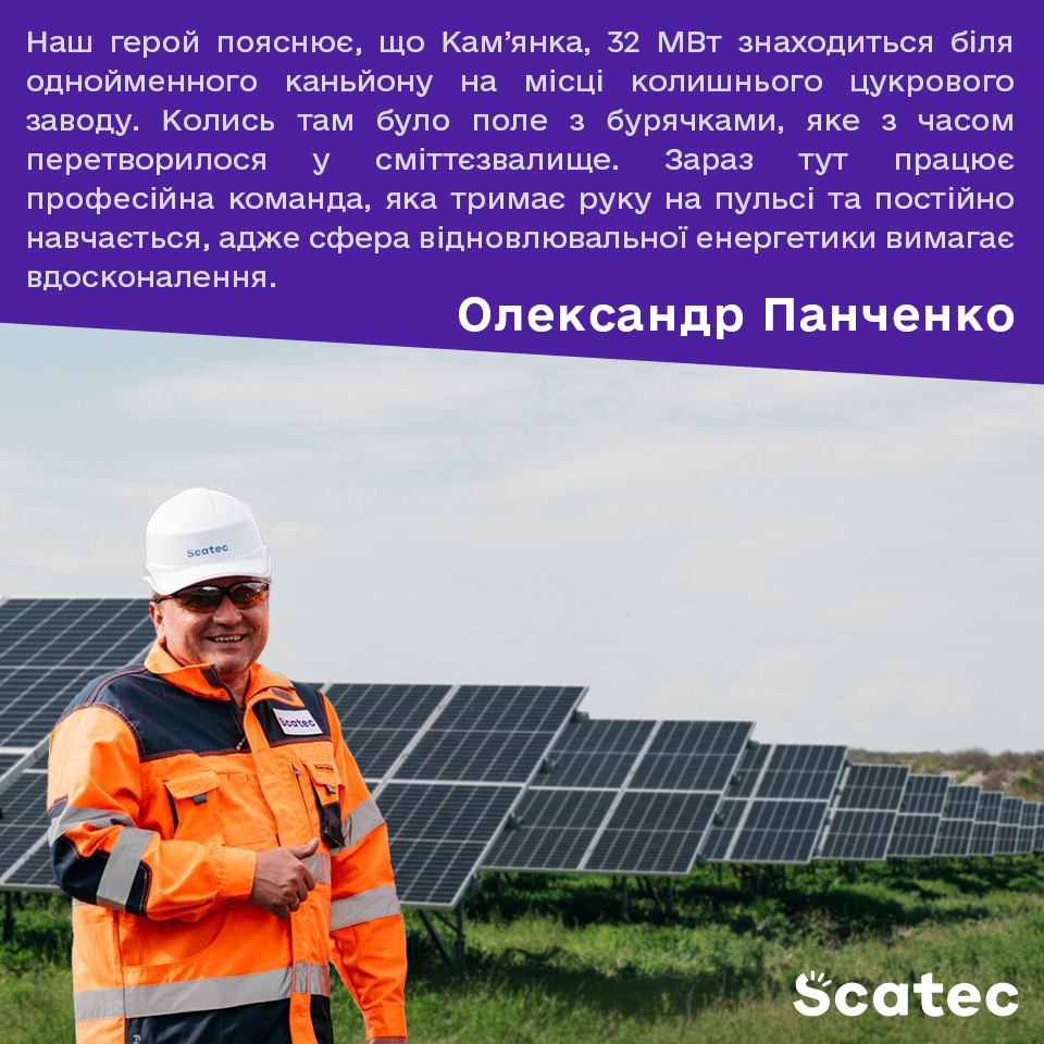 Наш герой пояснює, що Кам’янка, 32 МВт знаходиться біля однойменного каньйону на місці колишнього цукрового заводу. Колись там було поле з бурячками, яке з часом перетворилося у сміттєзвалище. Зараз тут працює професійна команда, яка тримає руку на пульсі та постійно навчається, адже сфера відновлюваної енергетики вимагає вдосконалення.